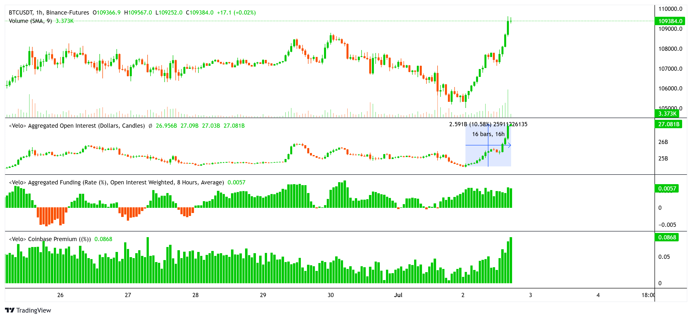 105.200 $ ‘dan 109.500 $’ a Bitcoin yükseltme, türev pazarlarda önemli hareketlilikle desteklenmiştir, bu da momentumun ele alındığını göstermektedir. Ana ticaret borsalarındaki açık pozisyonlar (OI) yüzde 10 arttı, yani yaklaşık 3,2 milyar dolar. Bu artış esas olarak uzun pozisyonlar ve beklentilere olan güvene neden oldu.