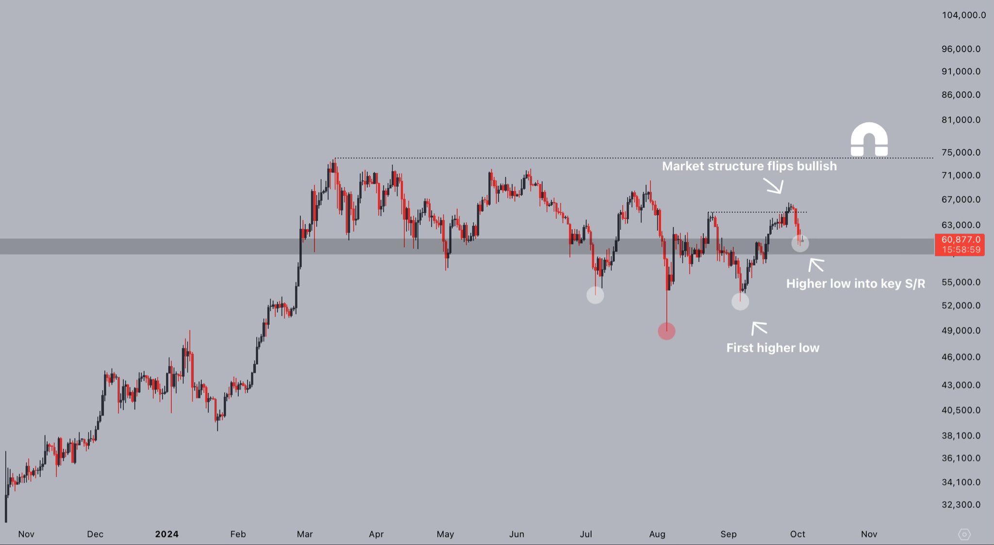 “Bu arada Bitcoin piyasa yapısı yeniden yükselişe geçiyor ve biz S/R anahtarını “Sarsınmayın”a çeviriyoruz.