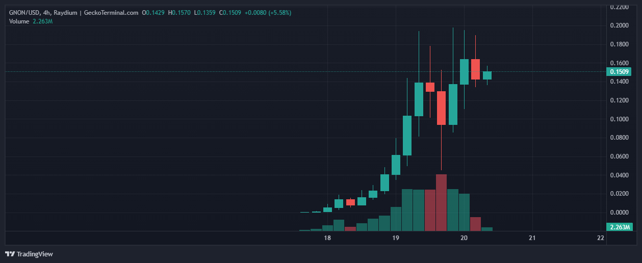 19 Ekim'de GNON tokeni Solana (SOL) fiyatına göre %233'ten fazla arttı. GeckoTerminal verilerine göre memecoin son 24 saatte %10'dan fazla artış gösterdi.