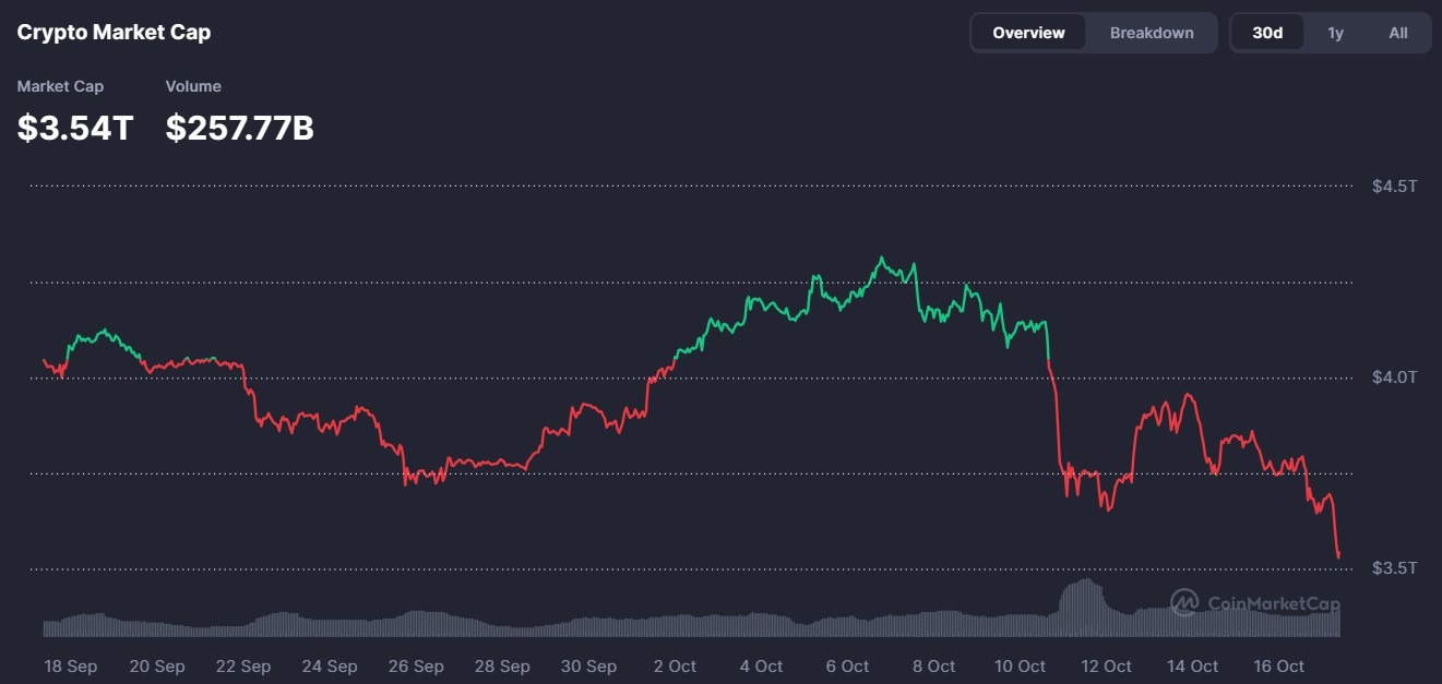 CoinMarketCap’in verilerine göre, toplam kripto para piyasası kapitalizasyonu, bir önceki günkü 3,78 trilyon dolara kıyasla Cuma günü yaklaşık %6 düşüşle 3,54 trilyon dolara geriledi. Bu, sektörden 230 milyar dolardan fazla değerin silinmesine neden oldu ve aylardır yaşanan en sert günlük düşüşlerden biri oldu.